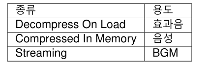 Compressed In Memory는 AudioClipm을 압축된 상태로 메모리에 로드한다.