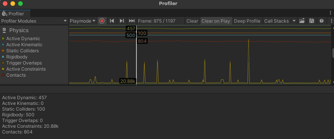 Profiler의Physics항목. 활성화된Rigidbody의개수뿐만아니라물리엔진에있는 각 요소의 개수를 확인할 수 있다.