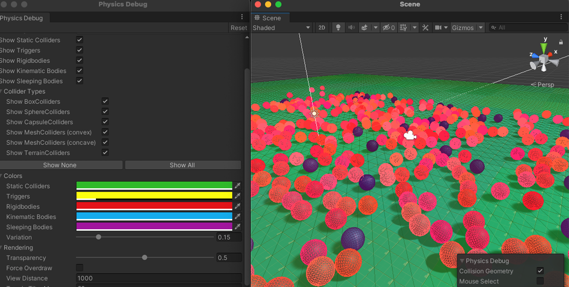 Physics Debugger, 씬의 오브젝트가 물리엔진 상에서 어떤 상태인지 색상으로 구분되어 표시된다.