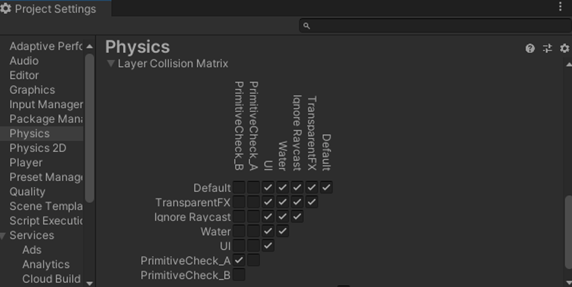 성능을 고려하면 물리 연산은 전용 레이어를 마련하고, 충돌할 필요가 ㅇ벗는 레이어간의 체크 박스는 모두 해제한다.